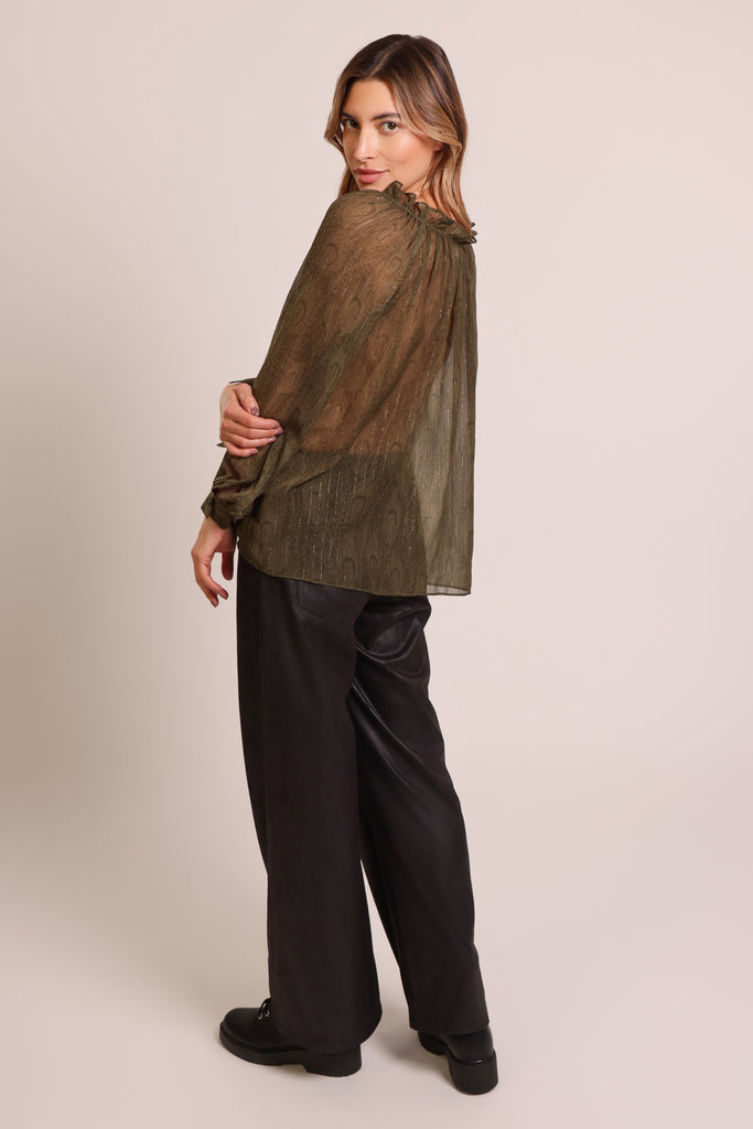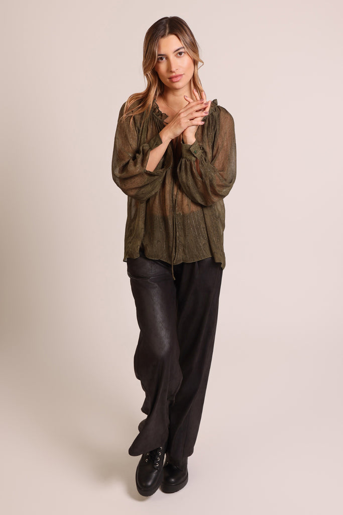 The Slow Motion Louis Top is a long sleeve relaxed fit blouse, with a pleated detail tie neck which helps to give it the most flattering shape. It looks stunning in this dark shade of green with subtle gold details. In a gorgeous sheer fabric which is great for layering.
