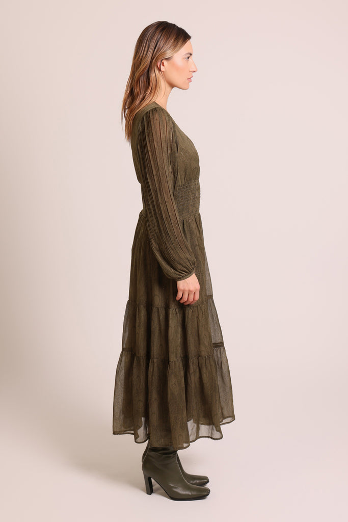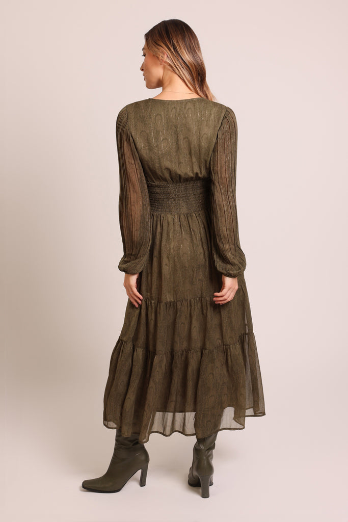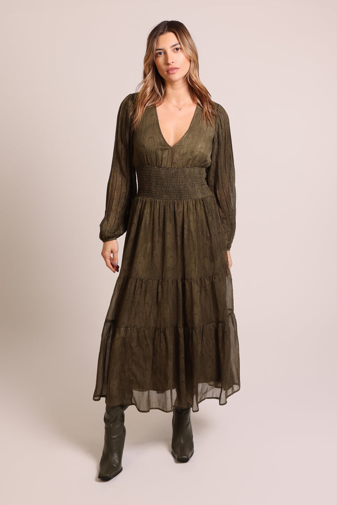 If you loved our Aurora dresses, you're sure to fall in love with the Whisper dress. A stunning long billow sleeved midi dress, with a flattering deep V neckline and a comfortable smocked waist that falls to a flowing tiered skirt. Perfect for the festive season in this green metallic fabric.