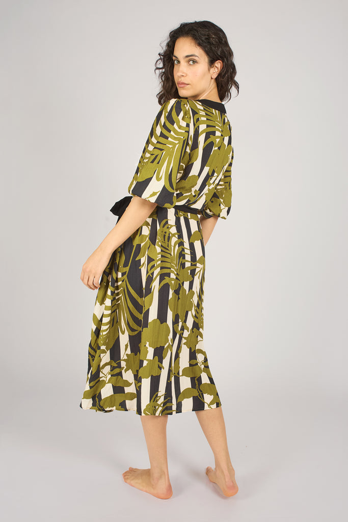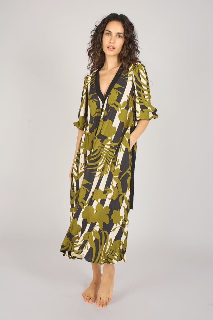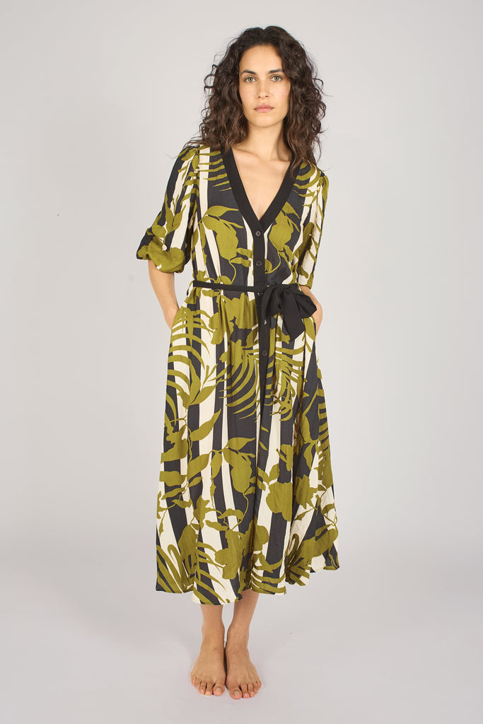 Our Grace Dress is a unique, summery shirt style midi dress. It has a button up front and tie waist, so that you can wear it closed and tied as a dress, or even open as a duster jacket. So versatile! In our black, white and green The Archive print.