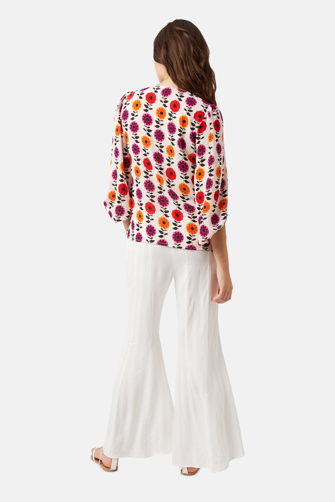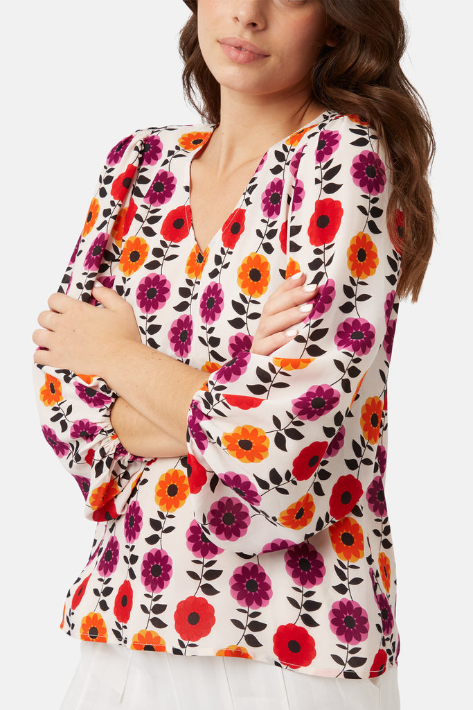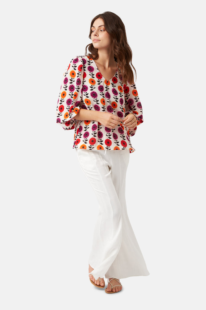This effortlessly charming Mollie top is detailed with a v-neckline and 3/4 billow sleeve. Loose and easy to wear.