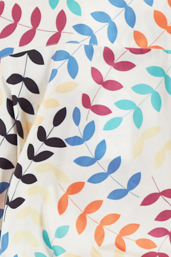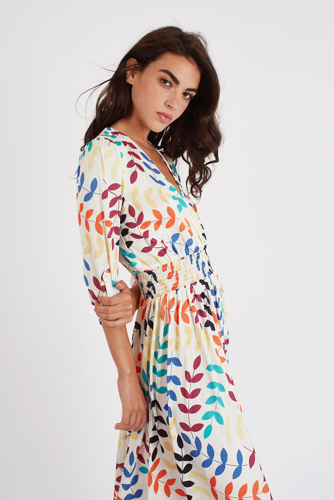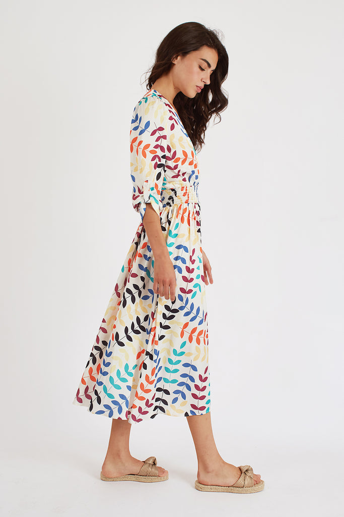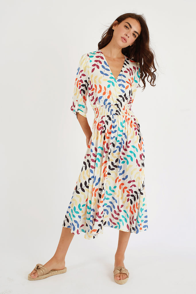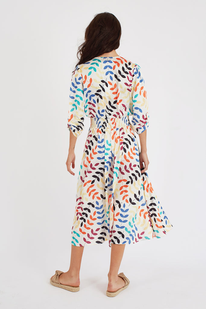 Our Maia dress is beautiful in this cream and multicolour leaf print. Featuring 3/4 length sleeves and a flattering smock waist that makes it all the more comfortable. The perfect, easy going midi dress to throw on on those warm Spring days. 80% Viscose 20% Silk.