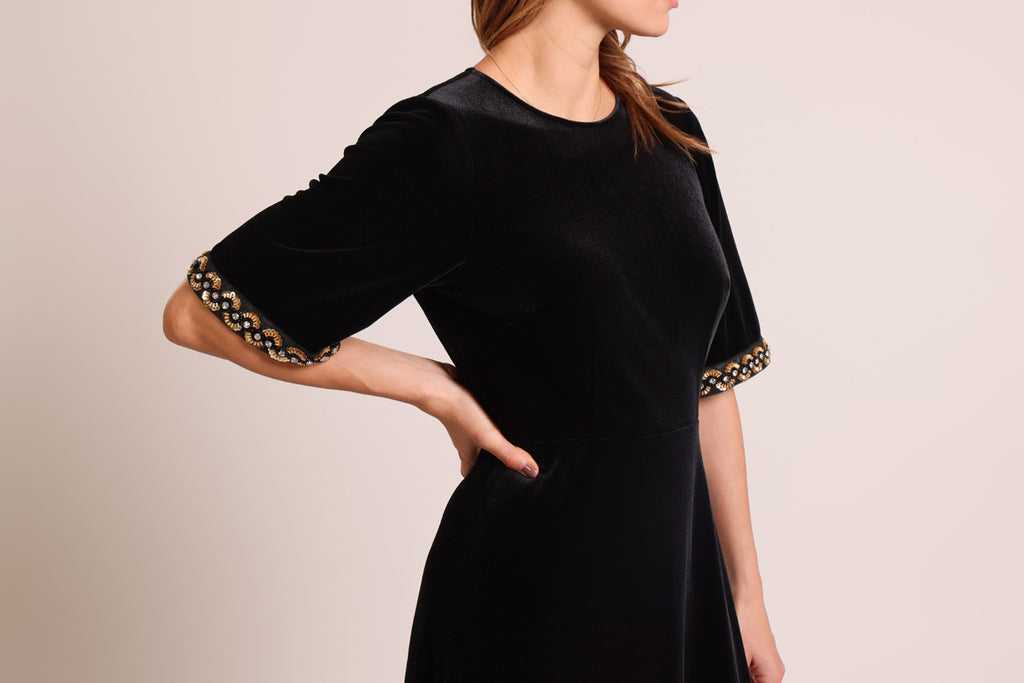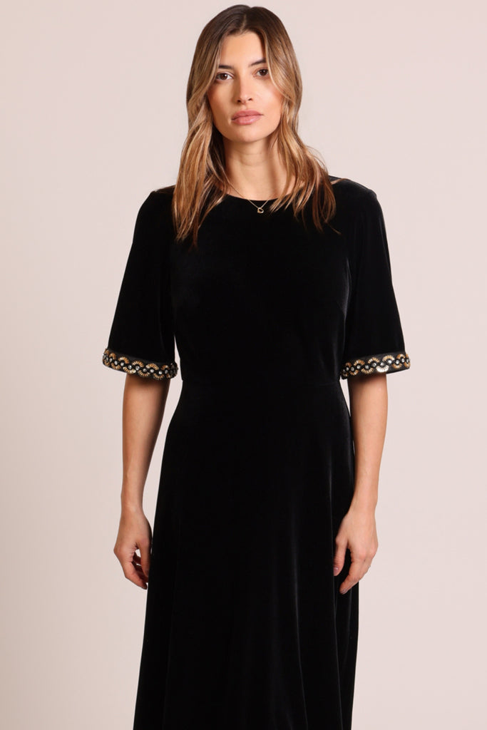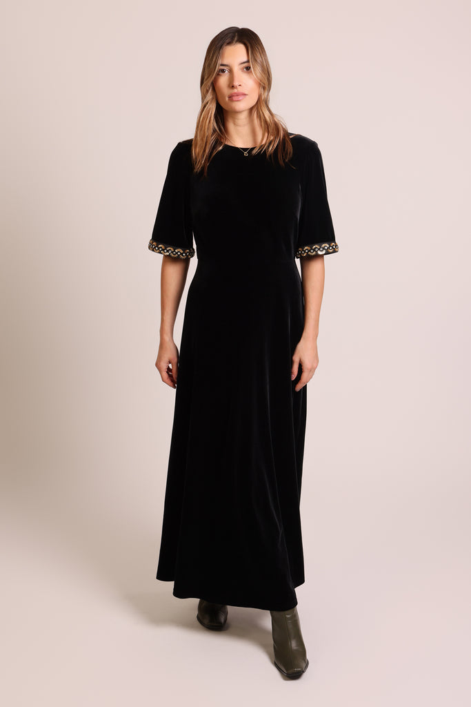 If you loved our Rene dress, we're sure you'll also love the Forgiven dress. A stunning boho style maxi dress cut with elbow length sleeves and a slightly cinched waist, leaving you with the most flattering silhouette. The gold embellishment on the cuffs adds an extra touch of elegance. Featured in this soft black velvety fabric. Just add heels for a stunning festive party outfit.