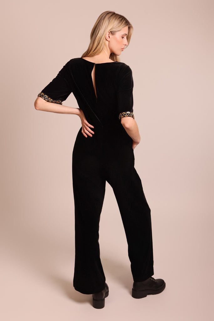 The No Going Back Jumpsuit is sure to become a staple in your Autumn/Winter wardrobe. The jumpsuit gives the most flattering silhouette, with mid length trumpet sleeves that are finished with a stunning gold beaded embellishment. The most versatile piece, especially in this elegant soft black velvet. Just add heels for a stunning festive party outfit.