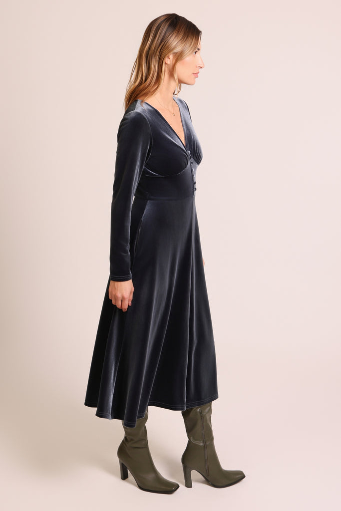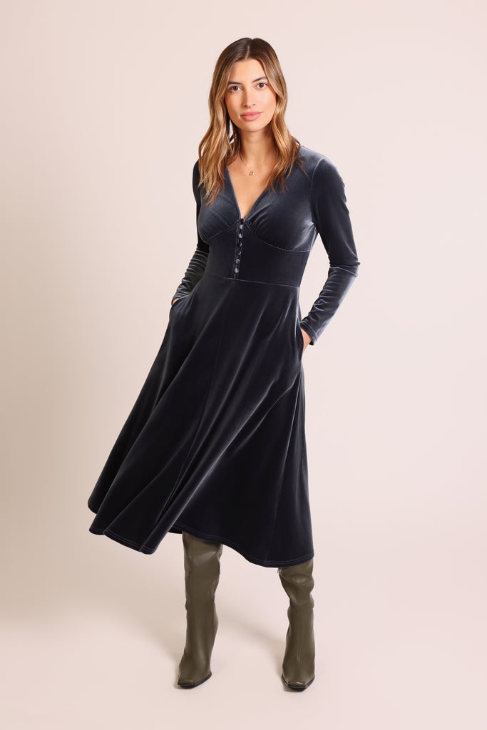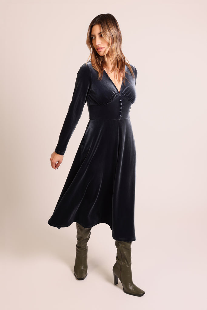The Mercy dress is perfect for the winter season. With long narrow sleeves, a V-neckline with small gatherings under the bust, and fabric covered buttons on the bodice. We're sure you'll be reaching for this dress all season. In a stunning dark blue velvety fabric. Just style with heels for a stunning festive party outfit.