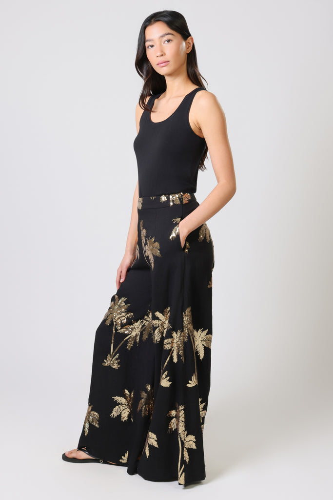 Our Rene women's trousers have the most comfortable wide leg fit. Featuring a flat front mid-rise waistband with smocked elastic in the back to allow for a more comfortable fit. They have the essential side pockets and are finished with a side zip fastening. Add some sparkle to your summer wardrobe in this black and gold palm tree sequined cotton. So easy to style to create a stunning party outfit. Pair with our matching Evie Top for the full outfit.