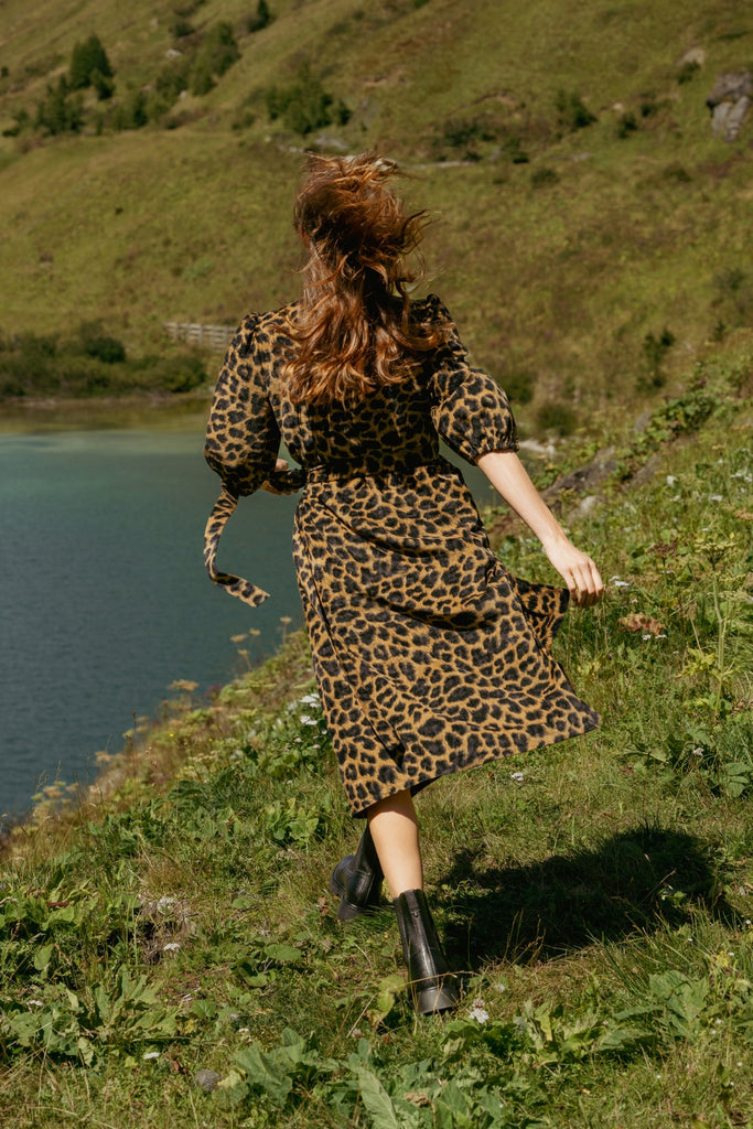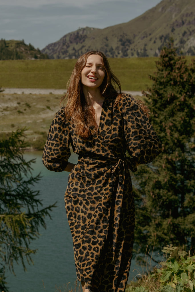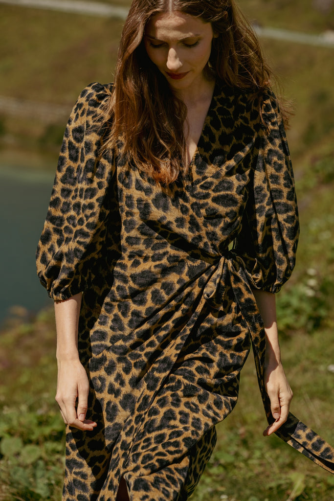 A classic V-neck wrap midi dress, with a tie waist, long sleeves with an elasticated cuff, and pockets. We're sure it will be a staple in your Autumn/Winter wardrobe, especially in this timeless brown and black leopard print. So easy to dress up or down for all occasions. Why not style with heels for a stunning festive party outfit! Unlined.