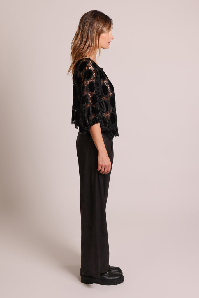 Relaxed and wide leg high rise trousers, which have a loose fit around the hip and thigh. They look stunning in this soft black suede blend. So easy to style - the perfect versatile trousers to add to your winter wardrobe. Style with a nice top and some heels for a stunning work or winter party outfit. Model is wearing with our The Great Silence Bloom Blouse.