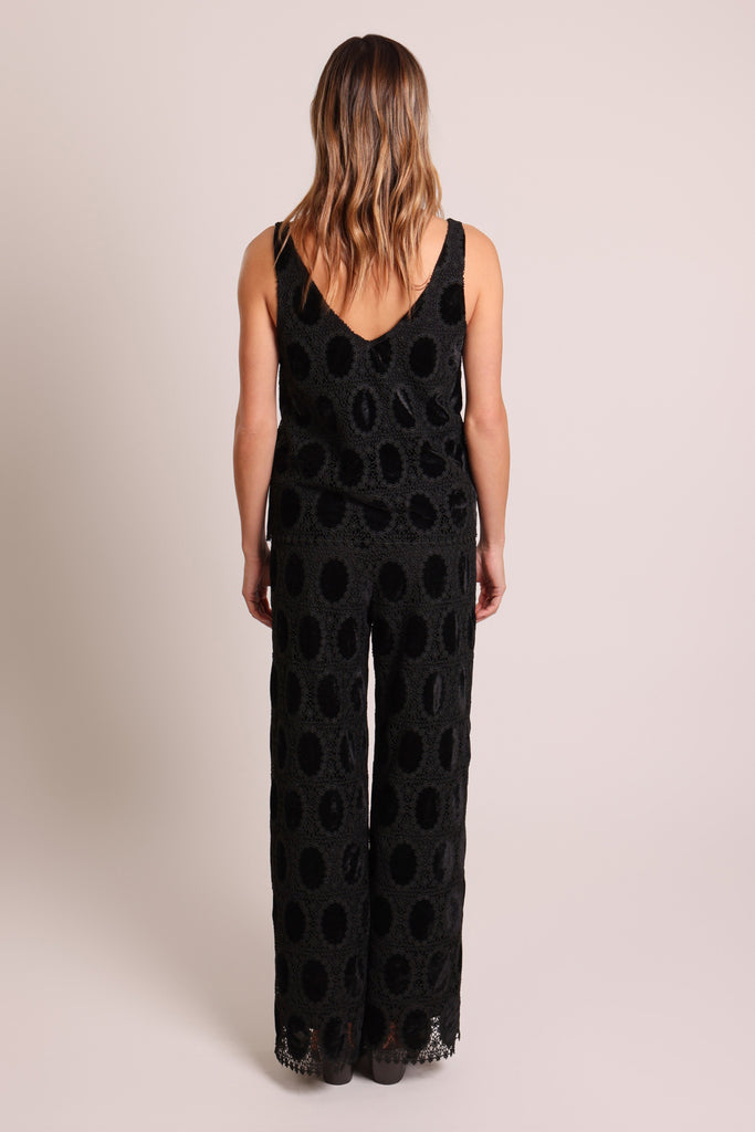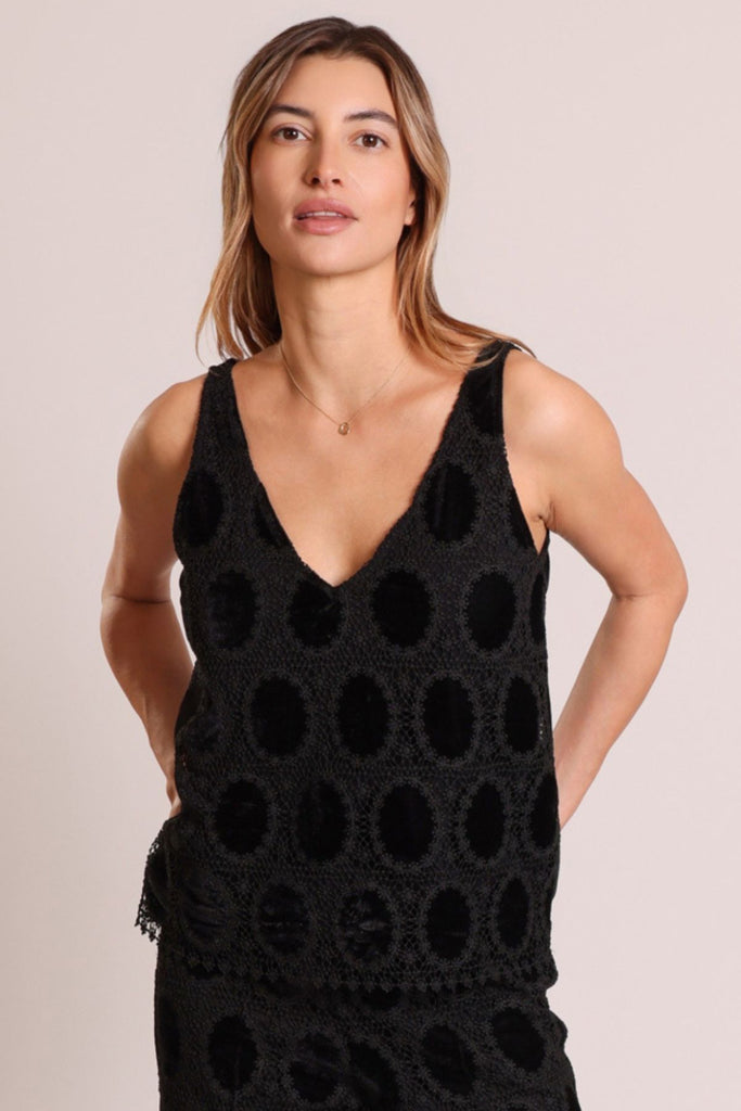 A classic sleeveless vest, but elevated in this stunning black crochet style fabric. It's a great versatile top that will carry you through the changing season. Perfect for dressing up for a festive party. Pair with our matching The Great Silence Trousers for the full outfit.