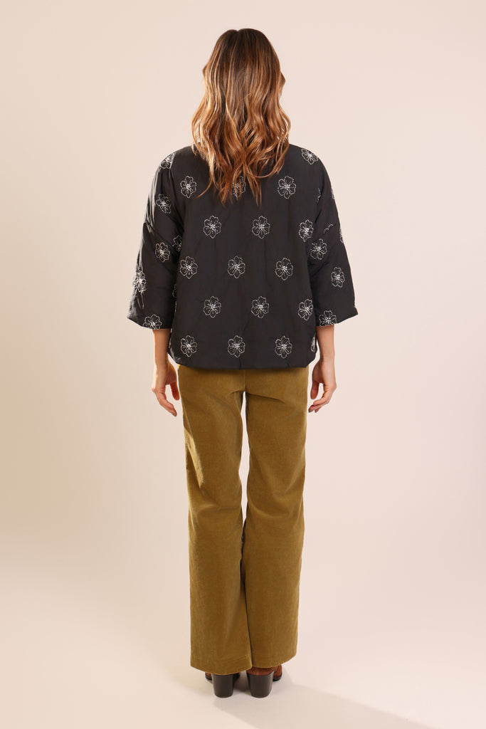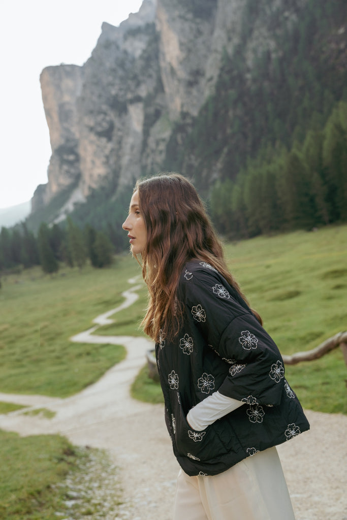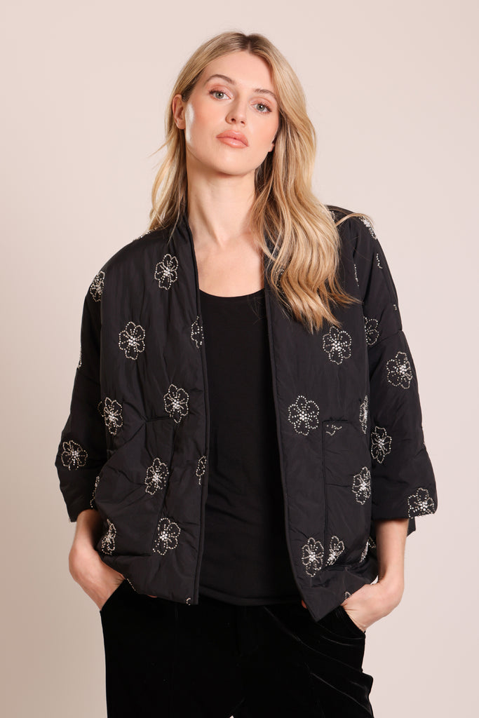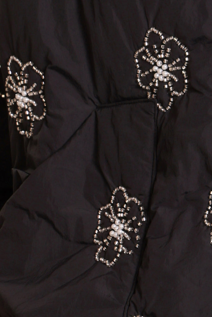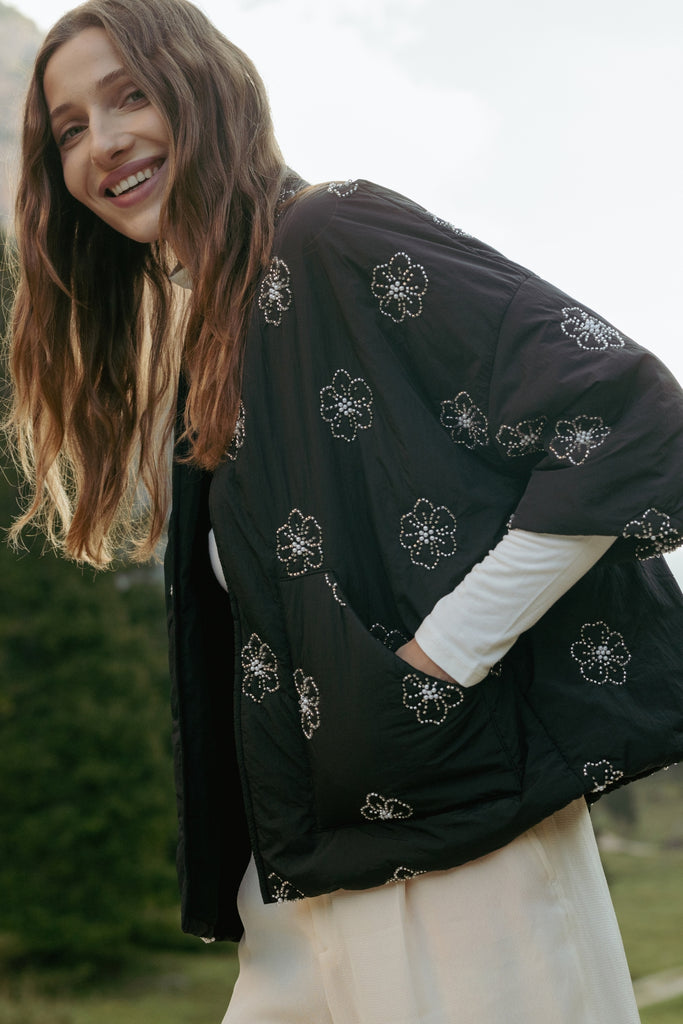 This stunning quilted shrug jacket comes in a cropped, boxy style fit with puffy sleeves and dropped shoulders for that perfectly relaxed look. It looks effortlessly chic in this black and silver floral beaded fabric. So easy to style for a beautifully casual winter outfit.