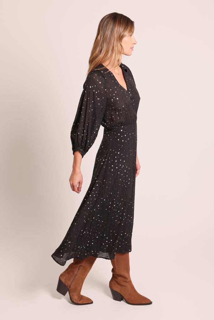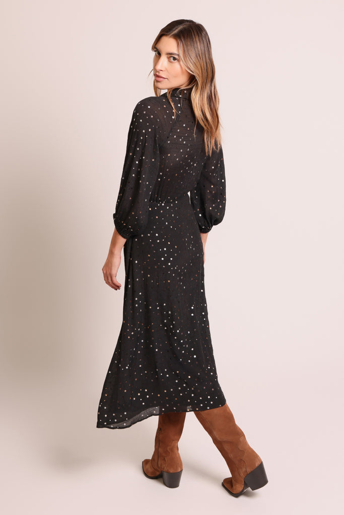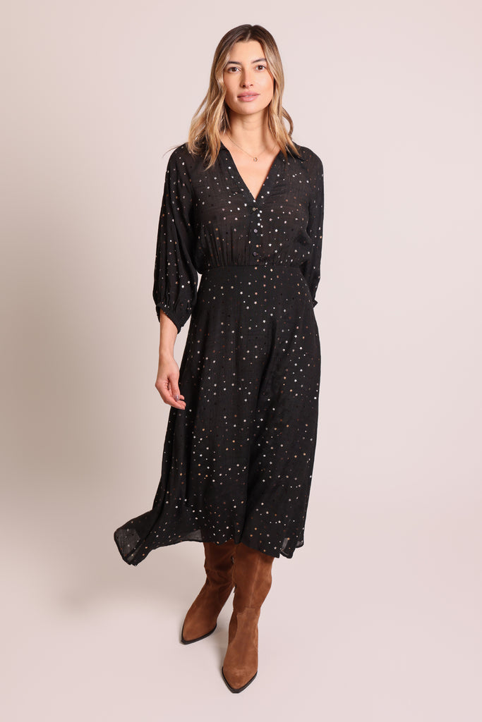 The Fusion dress is a simple midi dress with a classic V-neck shirt collar and an elasticated waistband to give the most flattering silhouette. It has 3/4 sleeves with elasticated cuffs and side pockets. Versatile, but unique in this black and metallic star print fabric. Just add heels for a stunning festive party outfit.