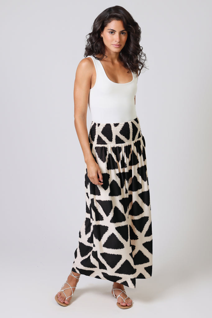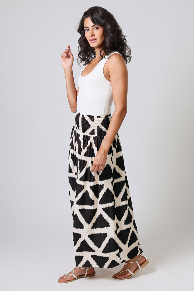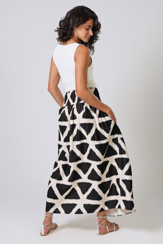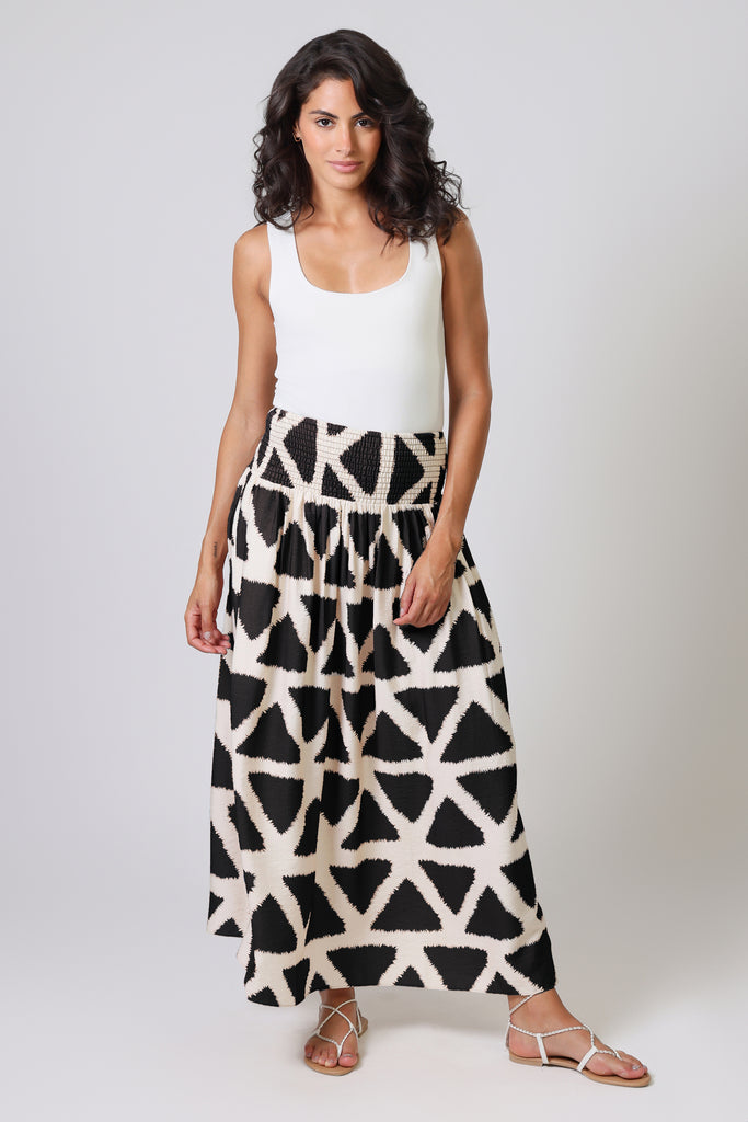 The Aurora Skirt has a classic A-Line shape, with an extra-wide elastic smocked waistband which is designed to allow for a low or high waist fit. Featuring side seam pockets. A stunning and versatile maxi skirt to add to your summer wardrobe. It has a unique black and white geometric triangular print, bringing some excitement to any Spring outfit. Pair with our matching Whispers Top.