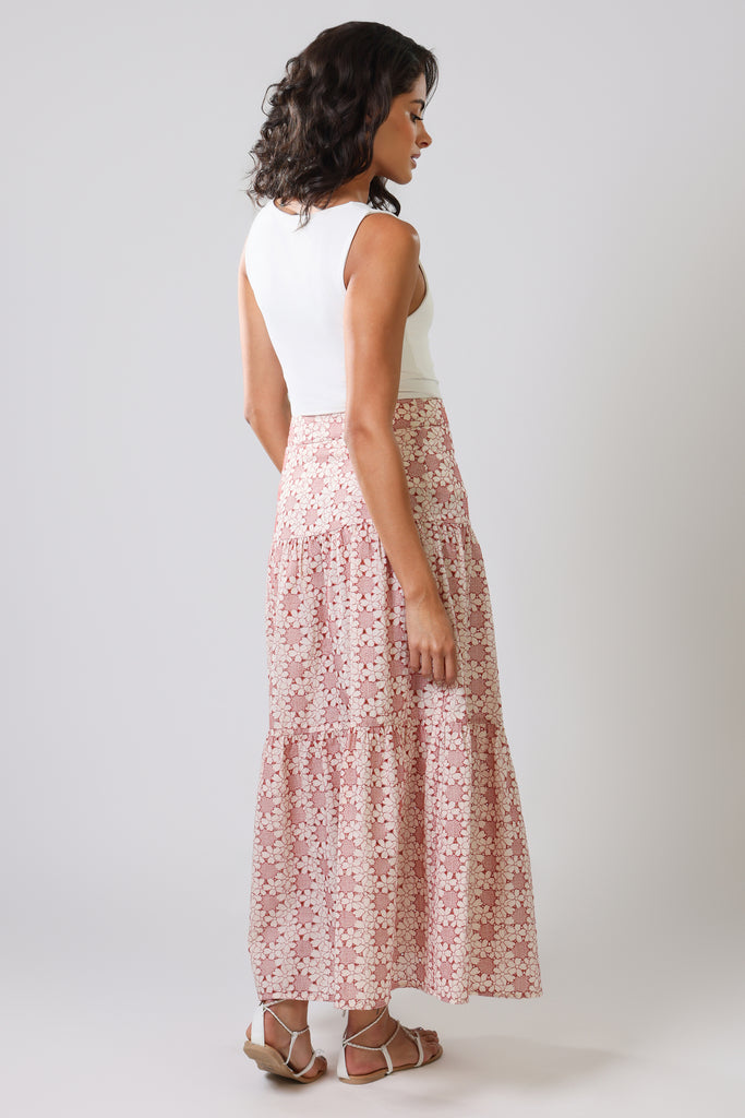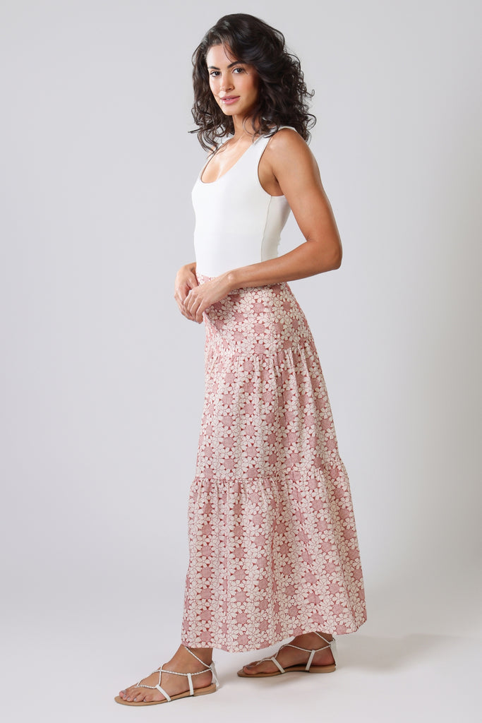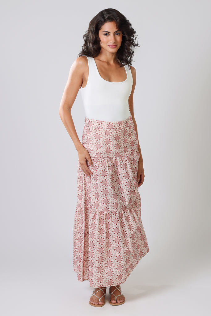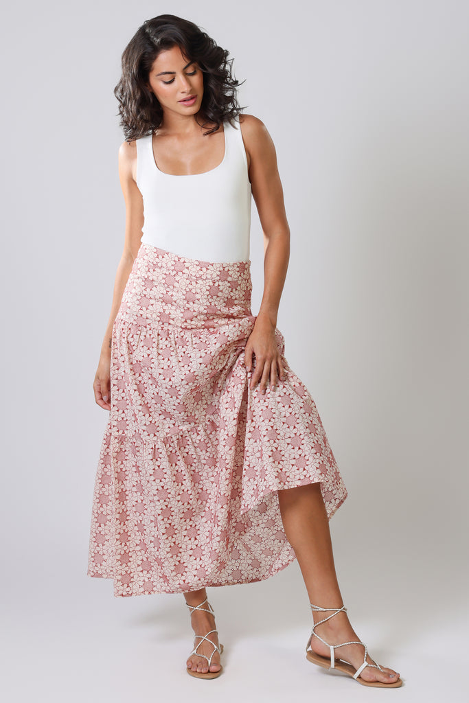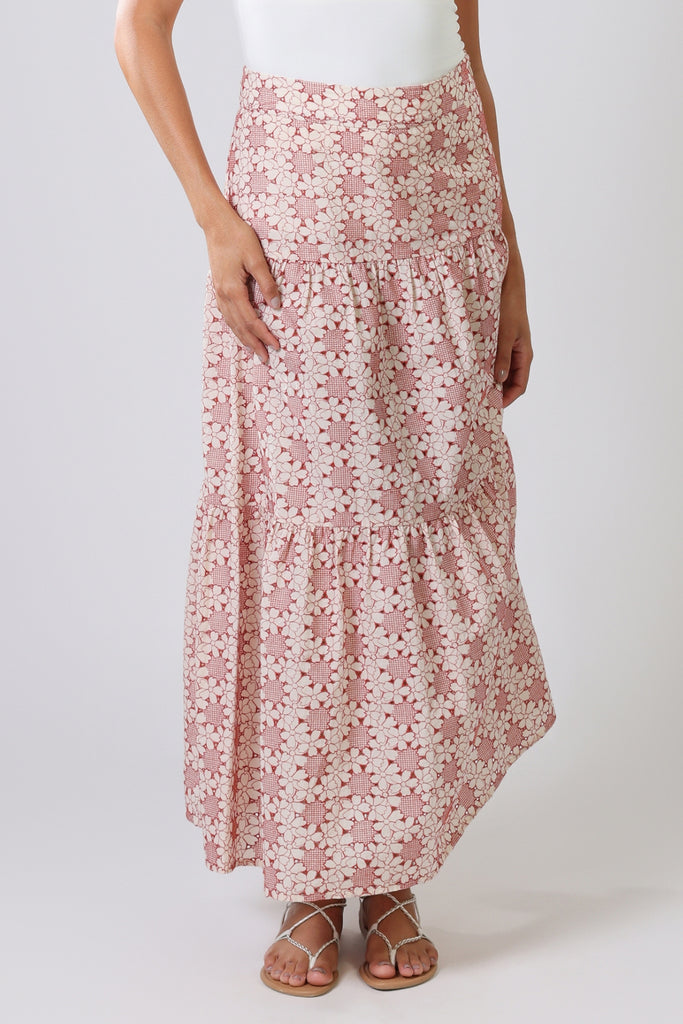 The Serenity Skirt is a beautifully structured, tiered maxi skirt. A classic mid-rise fit, with a back zip fastening. In a light and breezy 100% cotton fabric, it brings the perfect summer vibe. The red and white floral print brings the perfect splash of pattern and colour to your summer wardrobe. So easy to style with any top for a gorgeous summer outfit, especially when paired with our matching Rene Blouse.