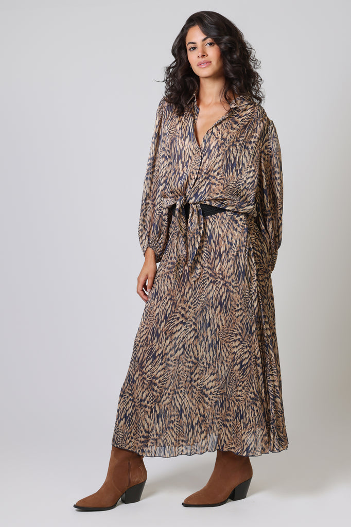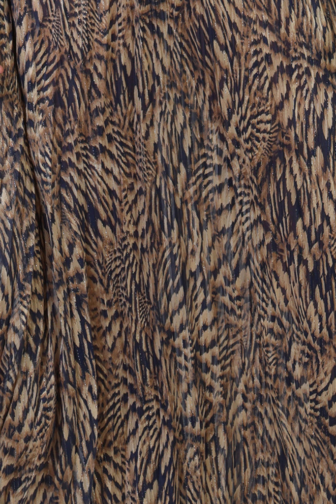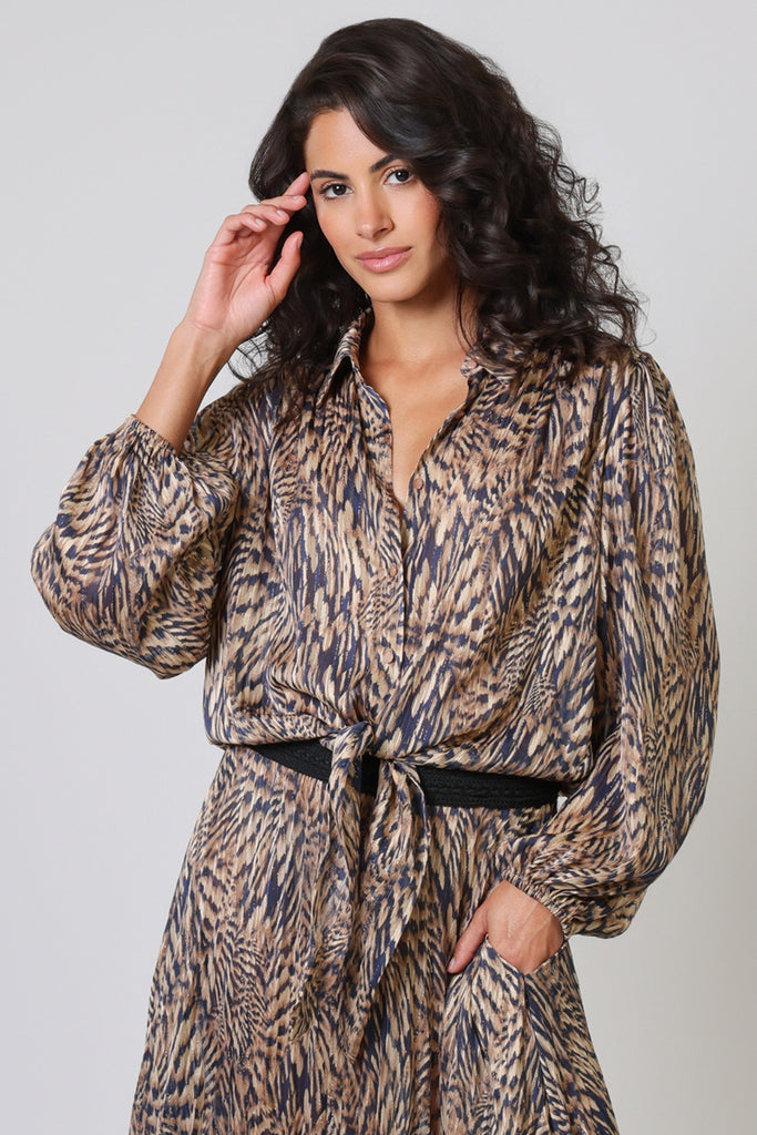 The Tremors Shirt has a classic women's button down shirt fit, but with a flattering front tie detail to make it all the more casual and comfortable. The blouse has long balloon sleeves with elasticated cuffs to create a relaxed silhouette. In this unique navy blue and brown animal style print, which has subtle threads of silver peeking through. Why not pair with our matching Hera Skirt for the full summer outfit.