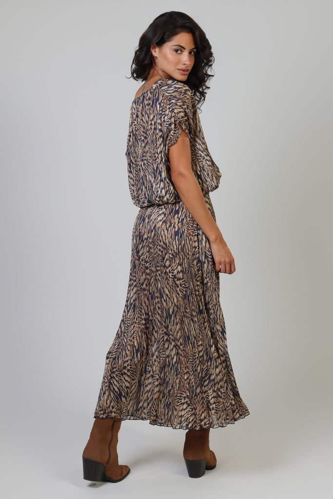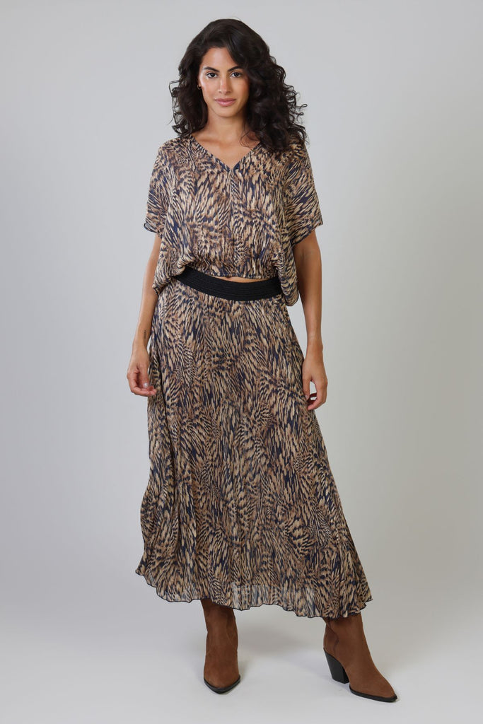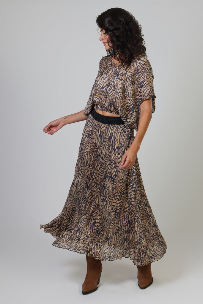 The Whispers Top gives the perfect casual summer boho vibe. A lightweight navy blue and brown animal print women's top, with short sleeves, a V-neckline and a deep cut back. The elasticated waist creates a relaxed and comfortable silhouette. It pairs perfectly with our matching Hera Skirt to create the perfect boho summer outfit.