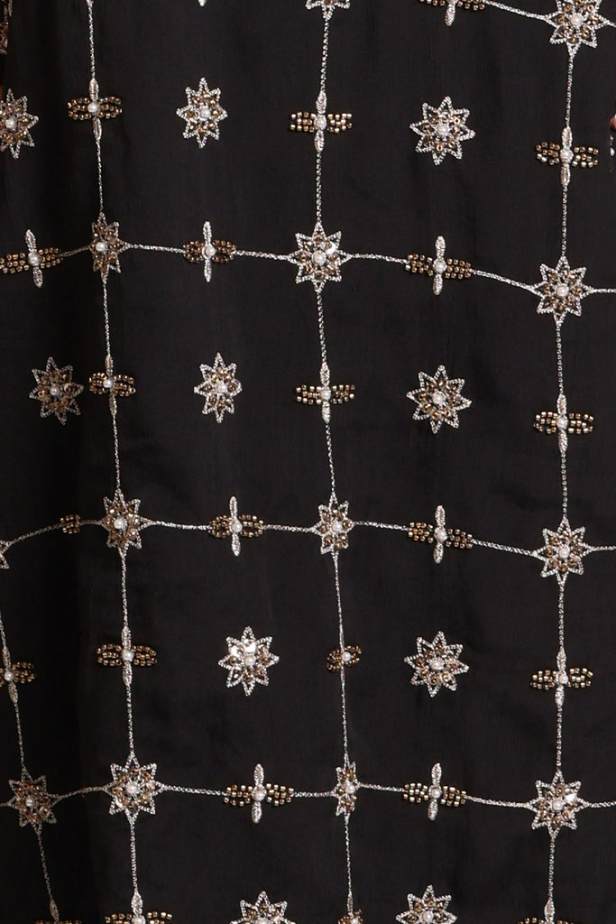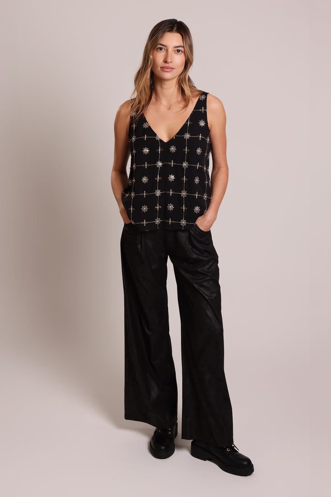 A classic sleeveless vest, but elevated in this stunning black and gold embroidered sequin fabric. It's a great versatile top that will carry you through the changing season. Perfect for dressing up for a festive party.