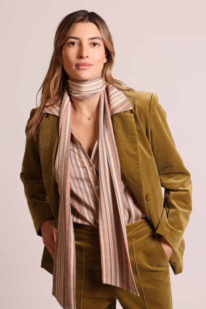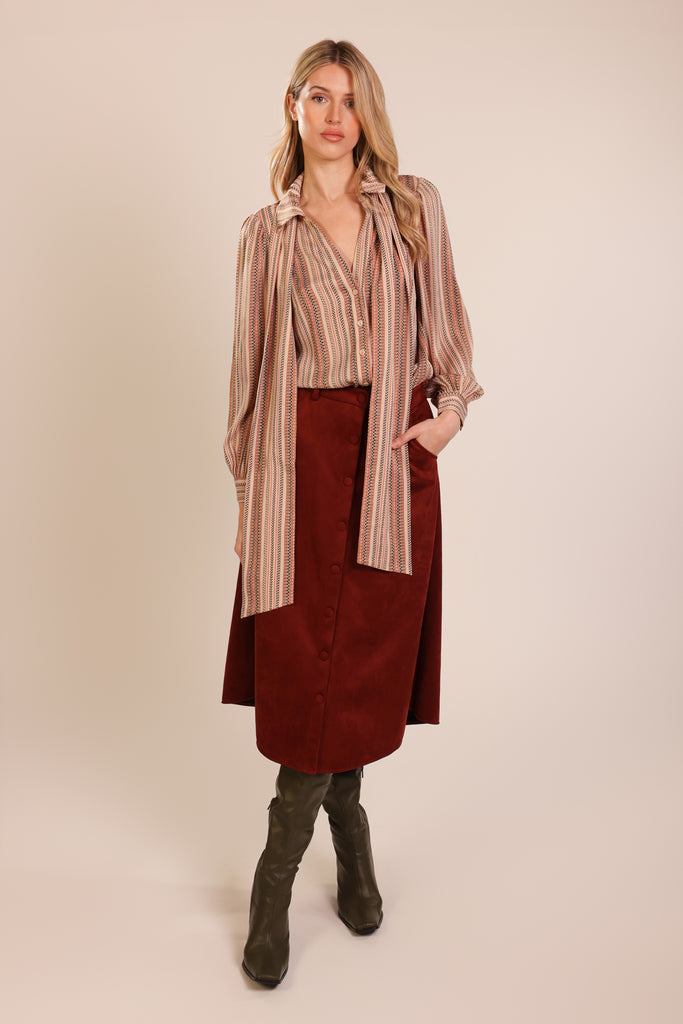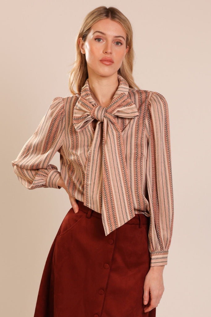 In a beautiful brown striped fabric, our Revenge Shirt is sure to be your go-to blouse for the season. A classic V-neck shirt, but with a removable bow which can be tied whichever way you like. The long balloon sleeves are finished with a buttoned cuff to give the most flattering silhouette. A perfectly versatile shirt which can be dressed up for down to suit all occasions.