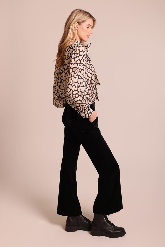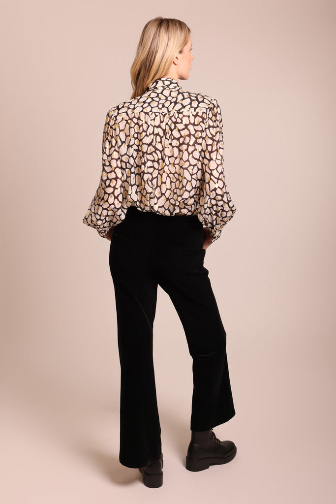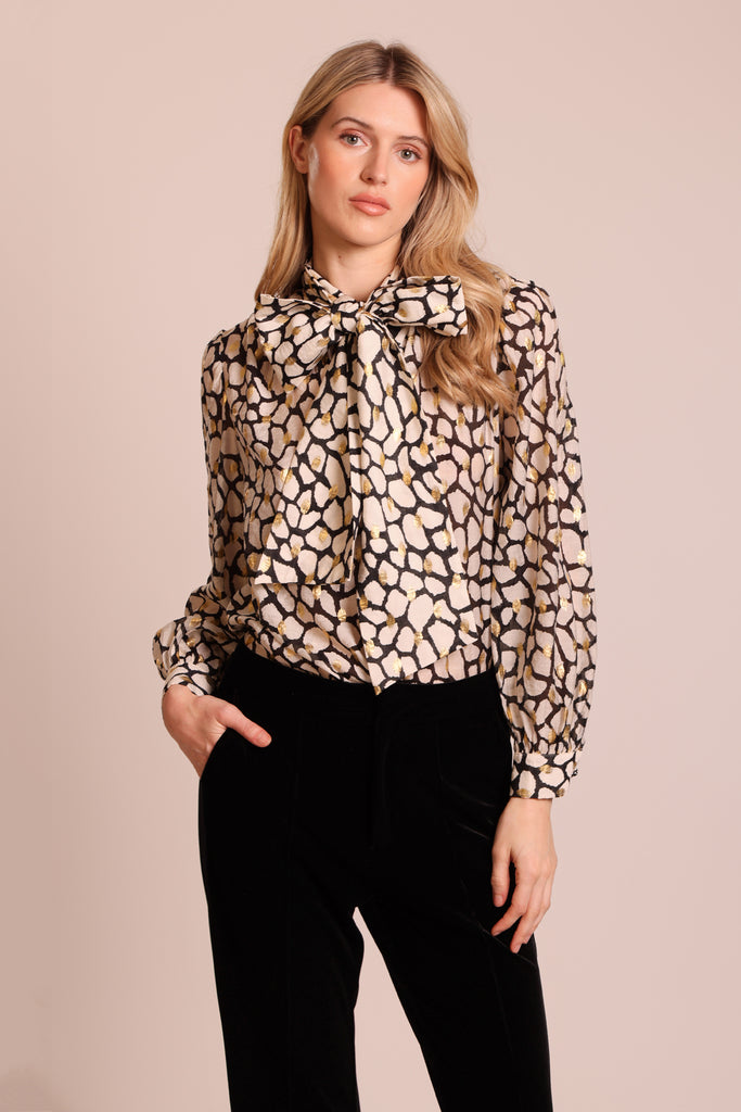 The Bonnie Blouse is a stunning top to include in your Autumn/Winter wardrobe. It has a beautiful mandarin collar with a detachable bow that can be tied whichever way you like. Featuring the most flattering balloon sleeves finished with an elasticated cuff. It's so unique in this bold white and black print with stunning gold spots. Perfect to style for a work festive party outfit.