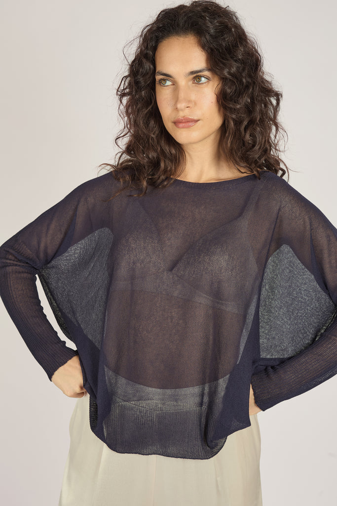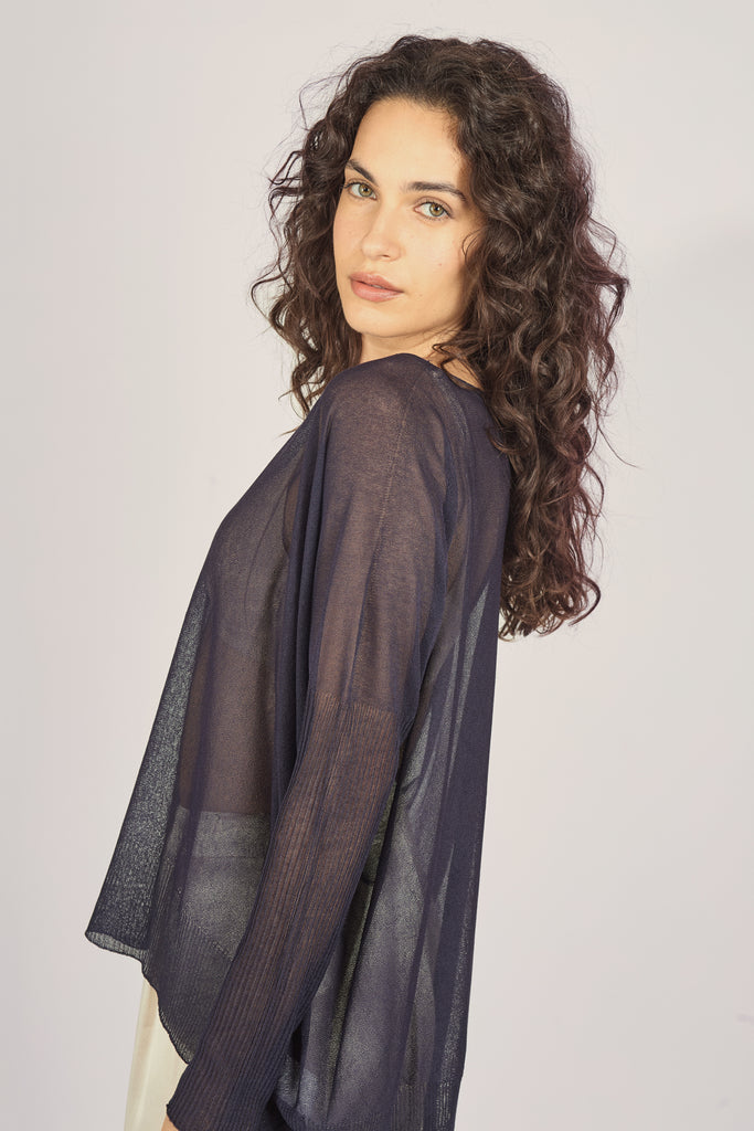 This knitted, long sleeve sheer top is the perfect layering piece to add to your summer wardrobe. Super lightweight and breezy, it works great as a beach cover-up. So easy to style in this dark shade of navy blue.
