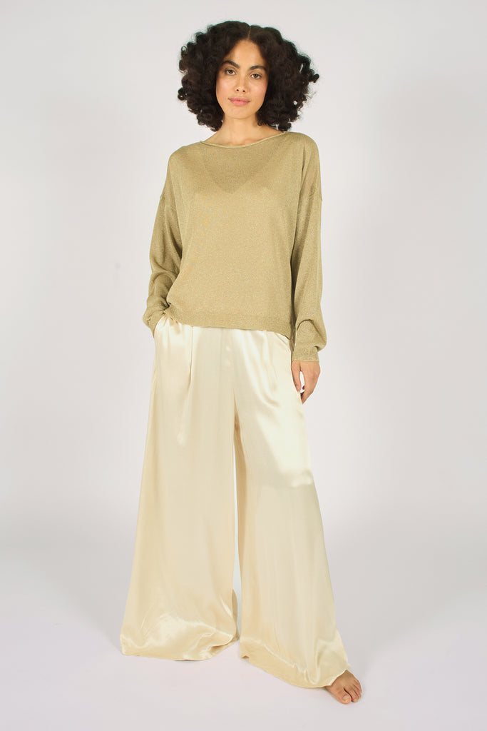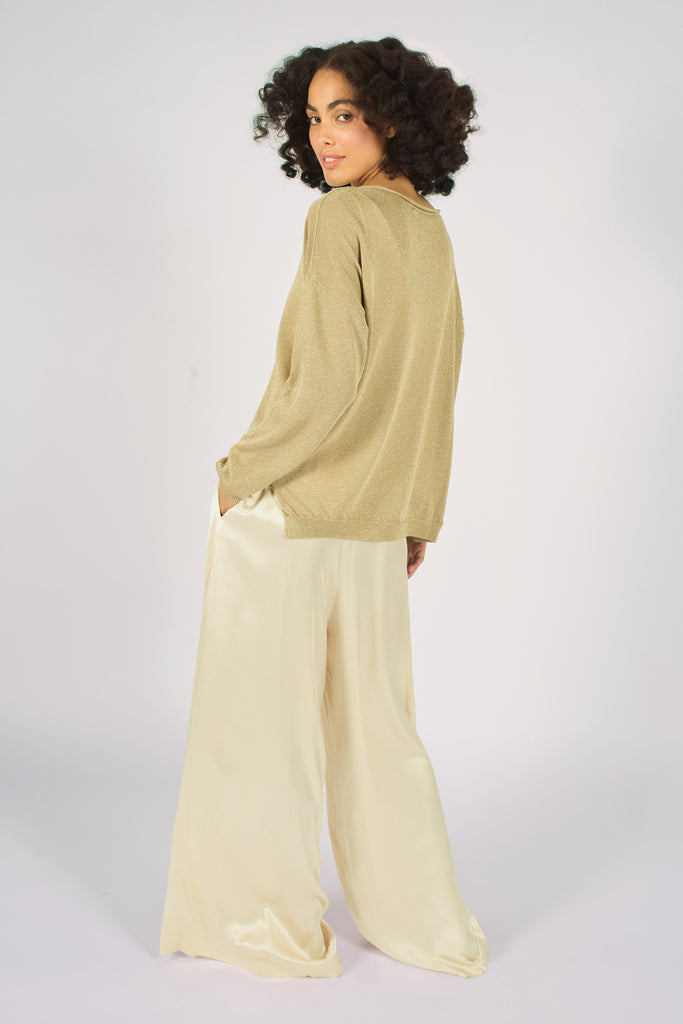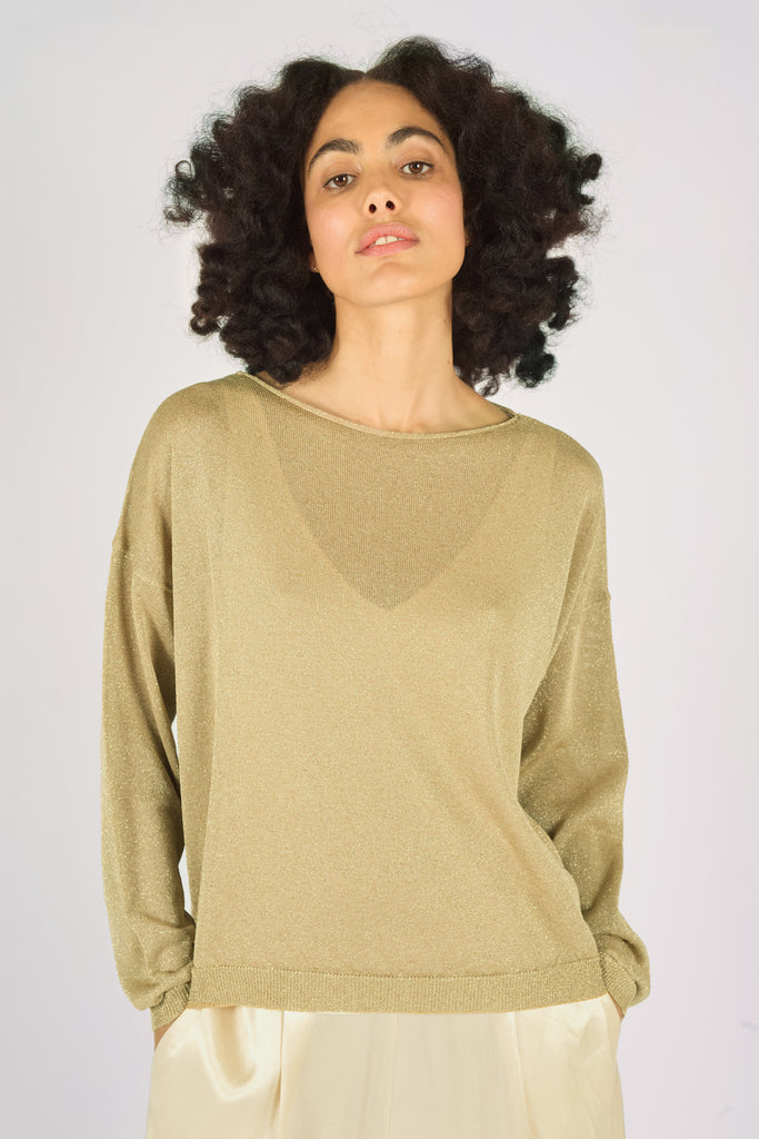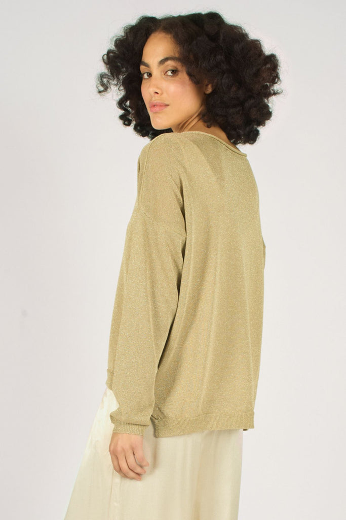 The Tarnish top is a stunning long sleeve, relaxed fit knitted top, with a flattering boat neckline. In a beautiful metallic gold. So easy to layer and style with any outfit.