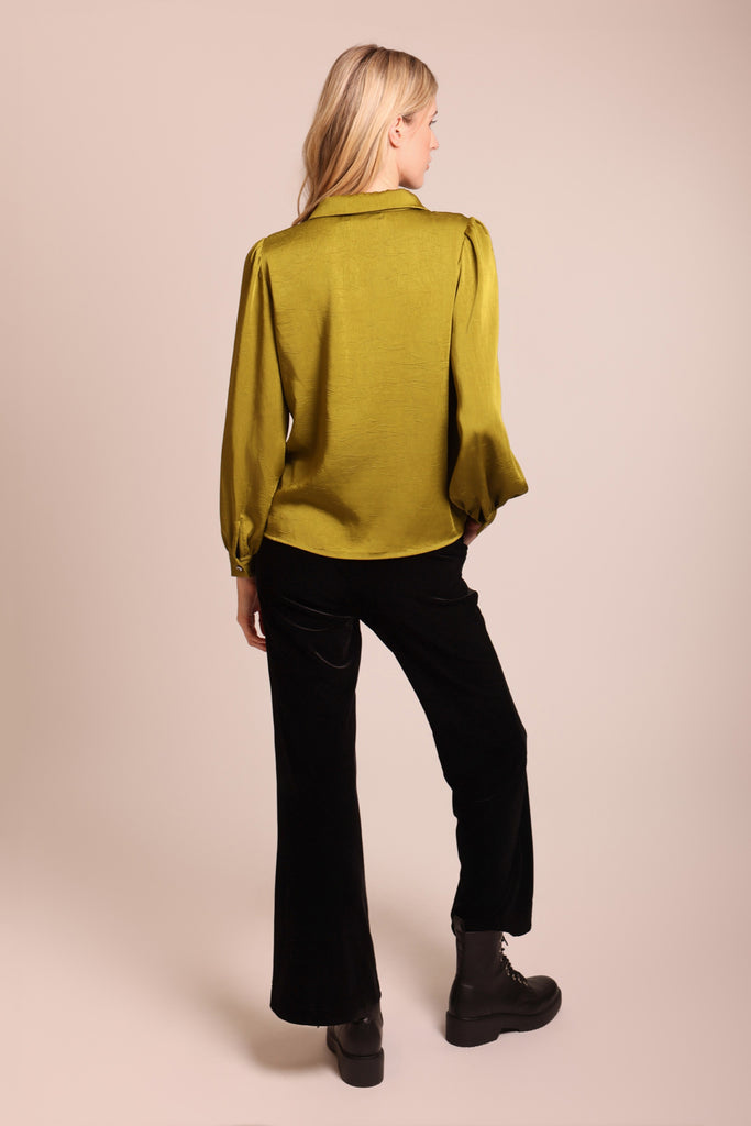 In a stunningly soft olive green fabric, our Revenge Shirt is sure to be your go-to blouse for the season. A classic V-neck shirt, but with a removable bow which can be tied whichever way you like. The long balloon sleeves are finished with a buttoned cuff to give the most flattering silhouette. A perfectly versatile shirt which can be dressed up for a stunning festive party outfit.