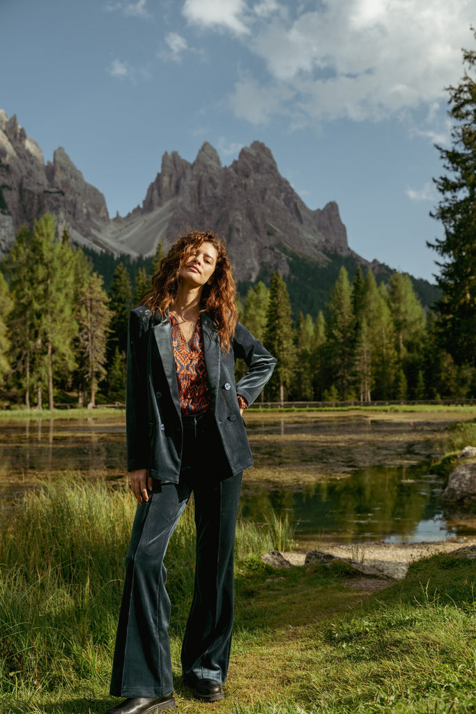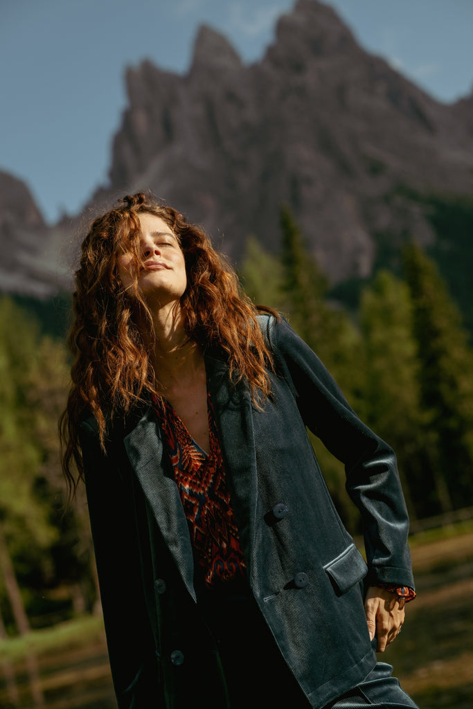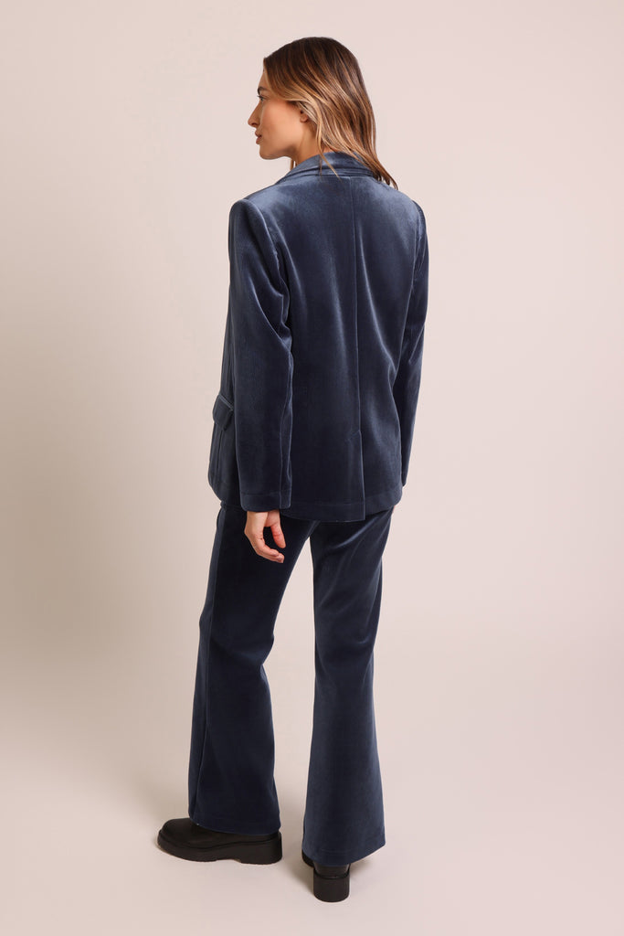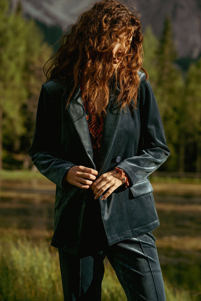 The Ava Rose Jacket is the perfect versatile piece to add to your winter wardrobe. Double breasted in a boyfriend length, it has a lapel collar and two front pockets. You'll soon fall in love with this luxurious dark blue velvet cord blazer in a relaxed fit. Unlined. Pair with our matching Ceeci Trousers for the full outfit.