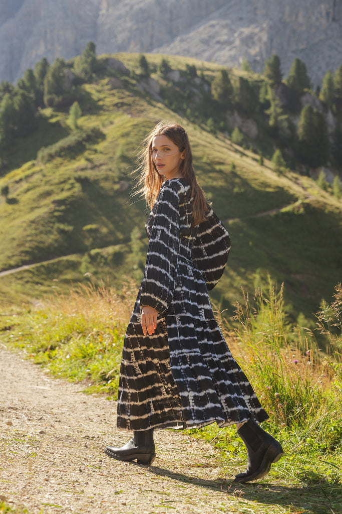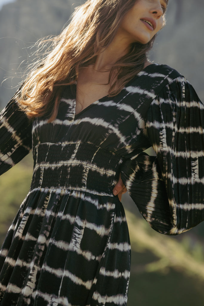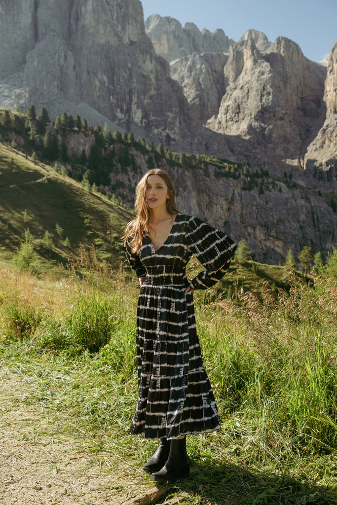 If you loved our Aurora dresses, you're sure to fall in love with the Whisper dress. A stunning long billow sleeved midi dress, with a flattering deep V neckline and a comfortable smocked waist that falls to a flowing tiered skirt. Effortlessly chic in this black and white stone wall print. Unlined.
