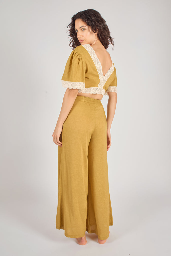 Our Evie trousers have the most comfortable wide leg fit. Featuring a flat front waistband with elastic in the back to allow for a more comfortable fit. They look gorgeous in this mustard yellow linen blend fabric. Pair with our matching Felicity Top to complete the outfit.