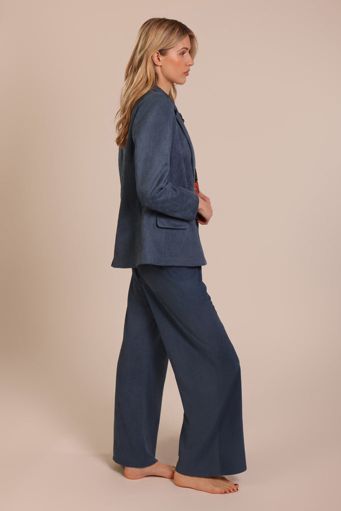 Relaxed and wide leg high rise trousers, which have a loose fit around the hip and thigh. They look stunning in this dusky blue suede blend. So easy to style - the perfect versatile trousers to add to your winter wardrobe. Style with a nice top and some heels for a stunning work or winter party outfit.