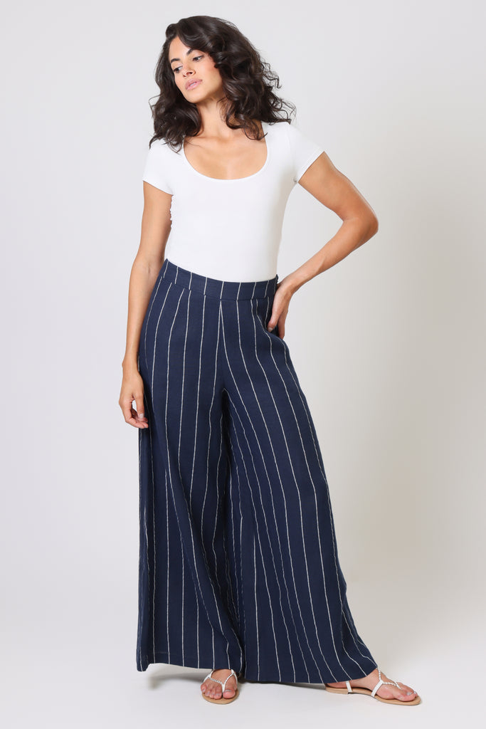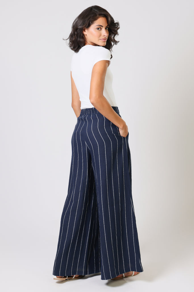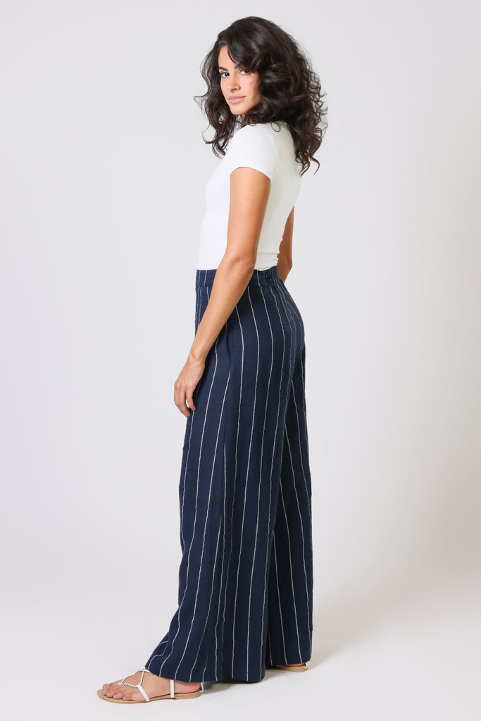 Our Rene women's trousers have the most comfortable wide leg fit. Featuring a flat front mid-rise waistband with smocked elastic in the back to allow for a more comfortable fit. They have the essential side pockets and are finished with a side zip fastening. Perfectly versatile for all occasions in this classic navy blue and white striped linen. Pair with our matching Claude Shrug for the full outfit.
