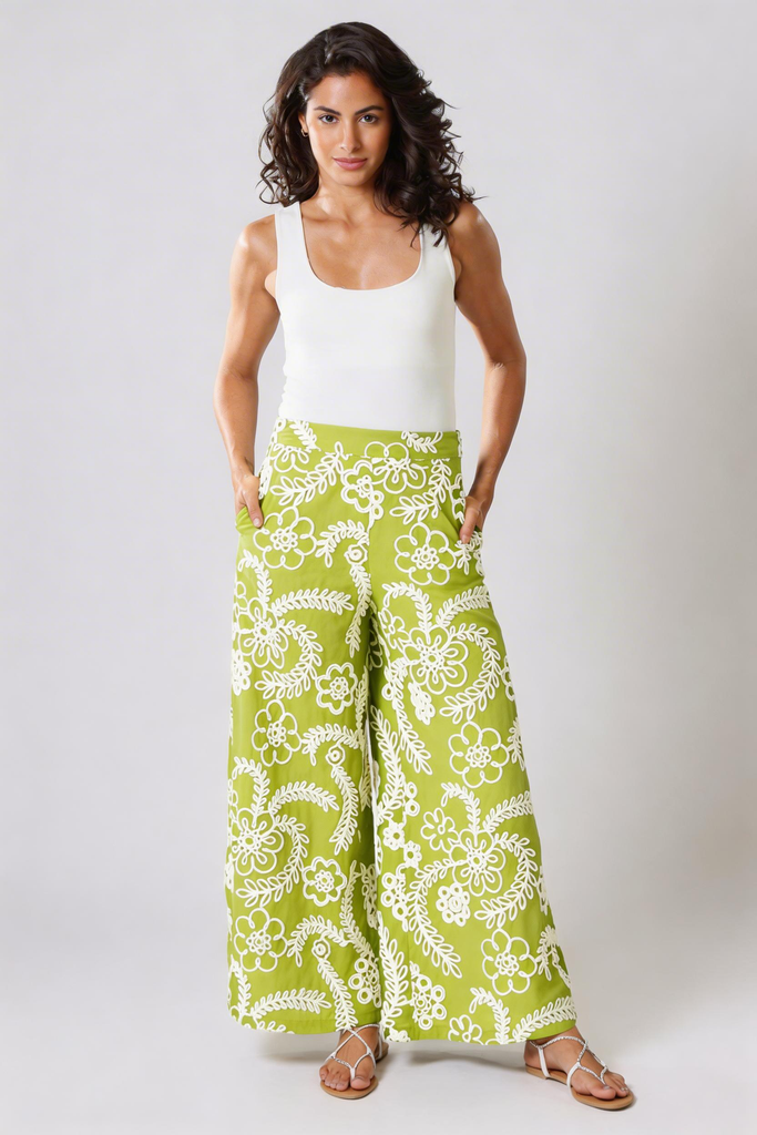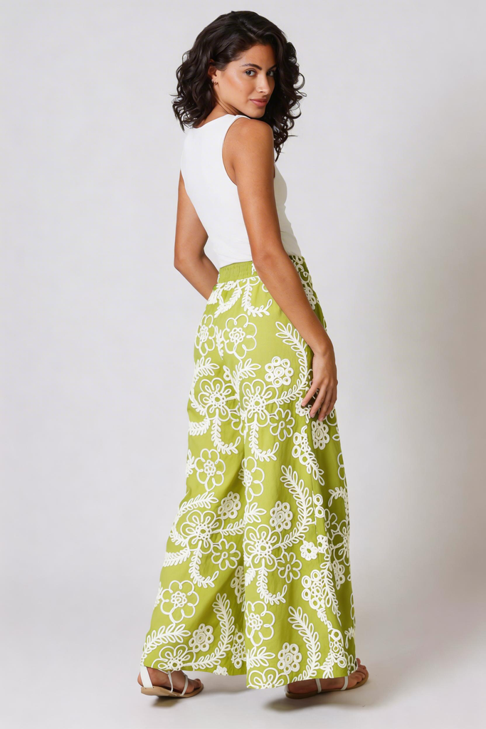 Our Rene women's trousers have the most comfortable wide leg fit. Featuring a flat front mid-rise waistband with smocked elastic in the back to allow for a more comfortable fit. They have the essential side pockets and are finished with a side zip fastening. Beautiful in this olive green and white embellished floral cotton.