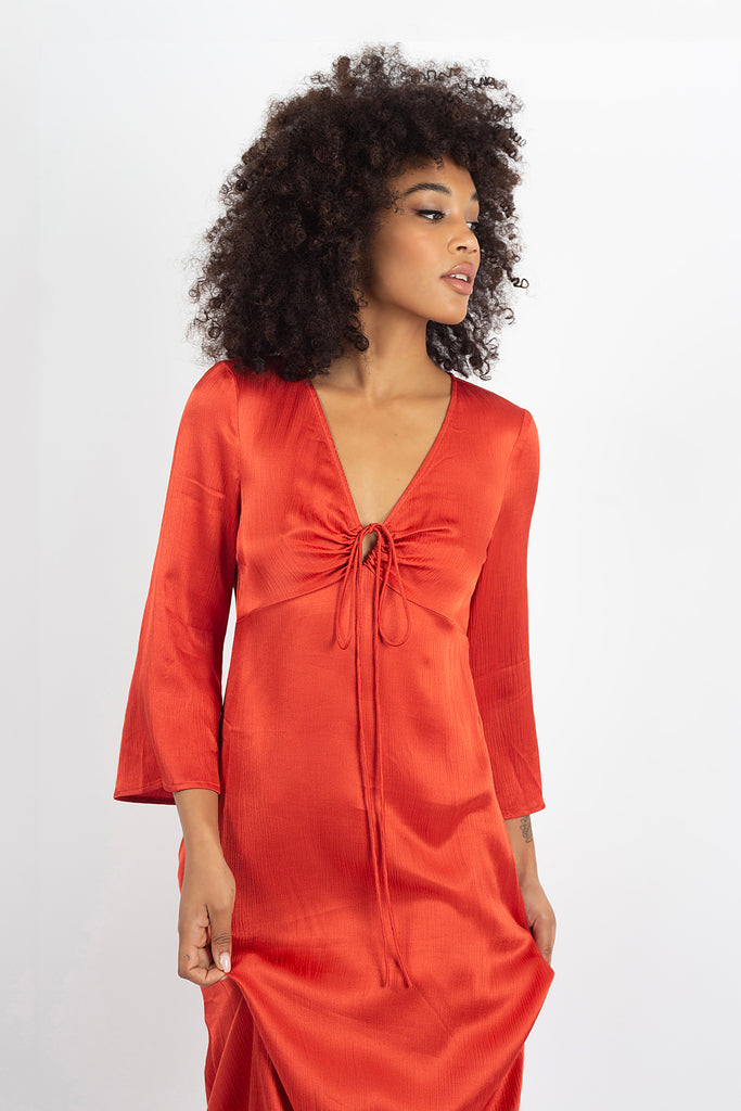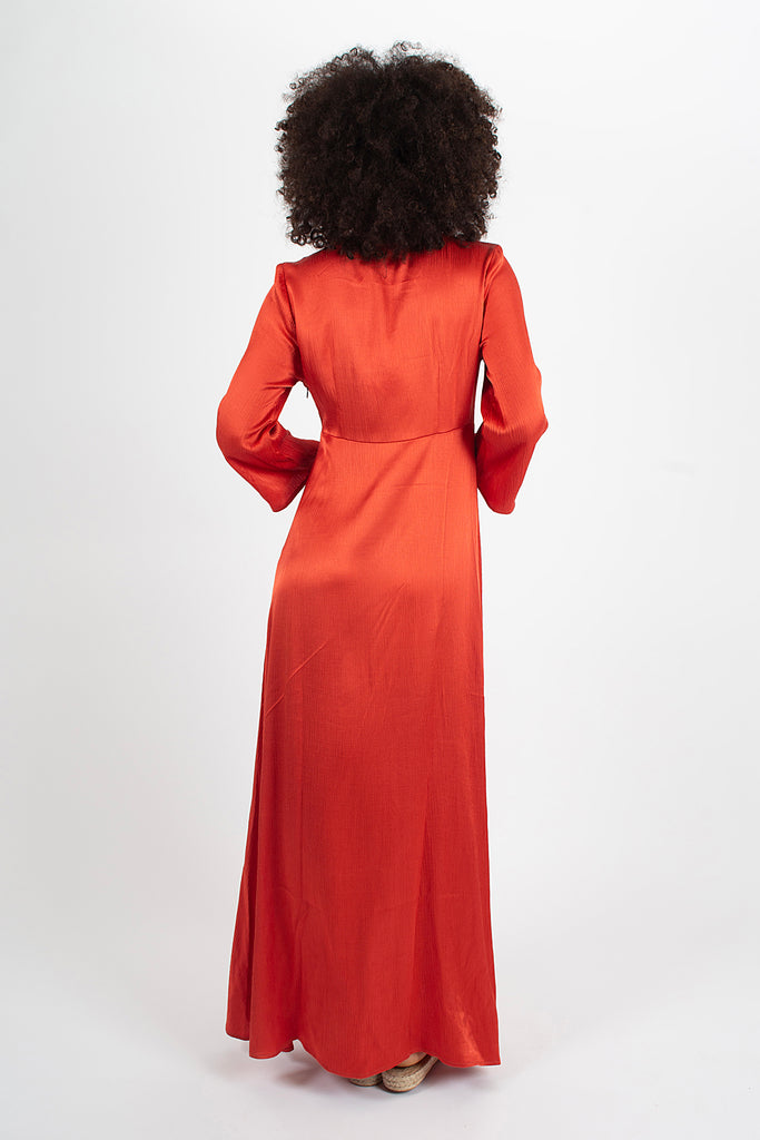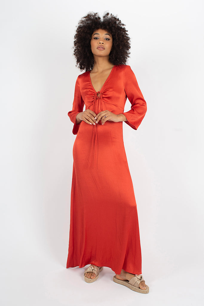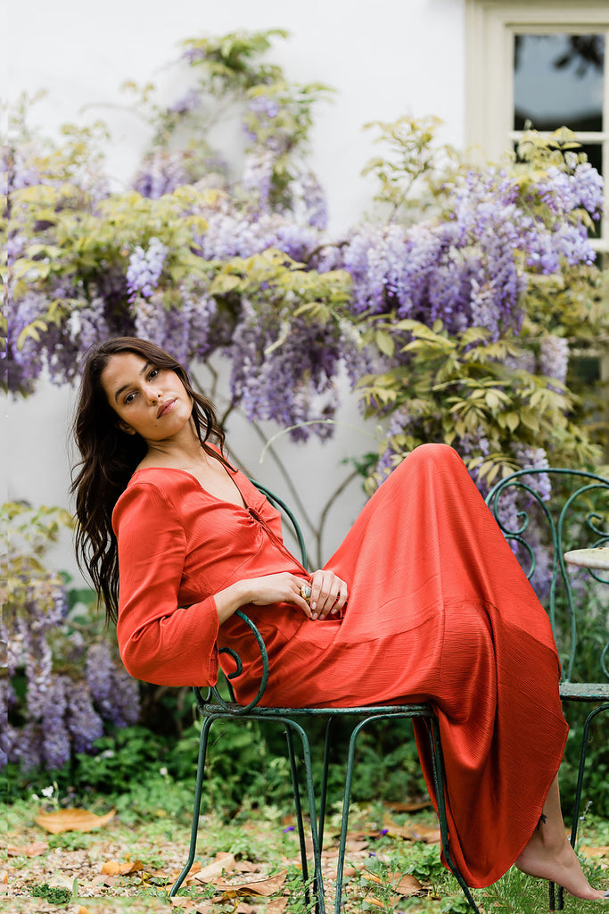The Bebe Dress is elegant, yet comfortable in this luxurious rust red tone. Long sleeves and a flattering tie at the bust, it is the perfect Spring maxi dress. Just pair with heels for a stunning wedding guest dress. Made with sustainable materials. 53% Tencel 47% Viscose.