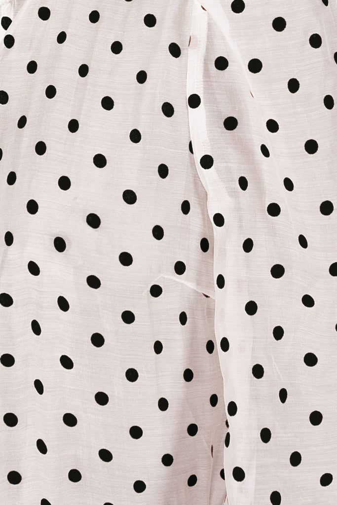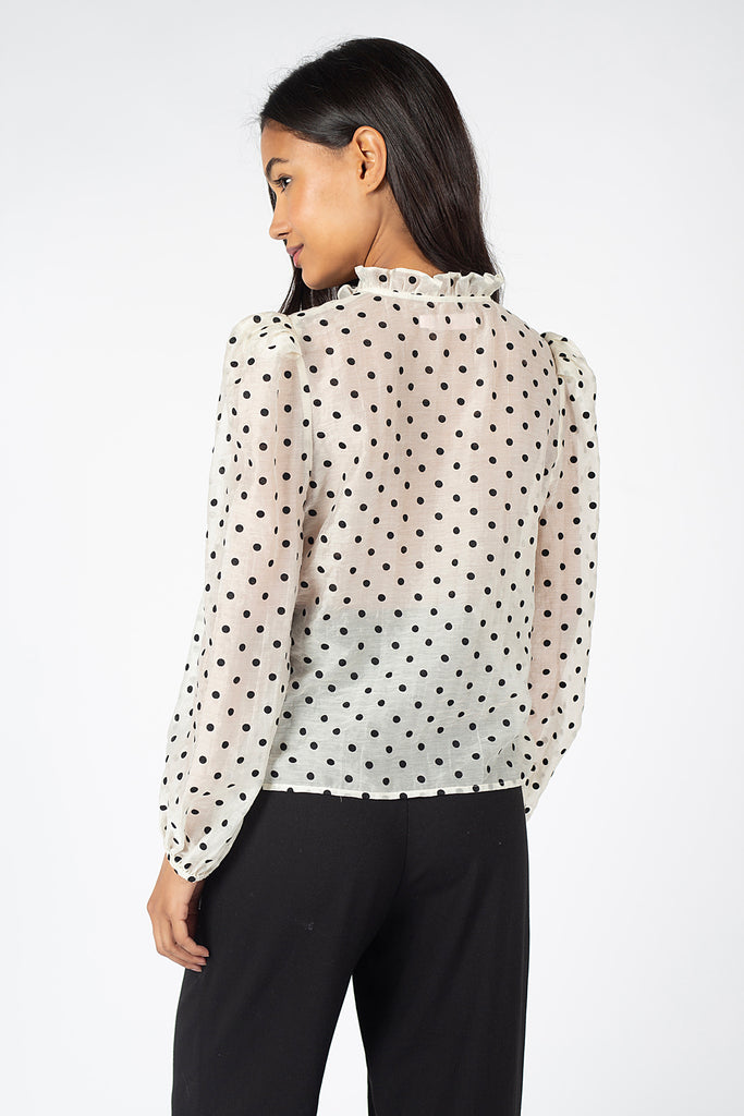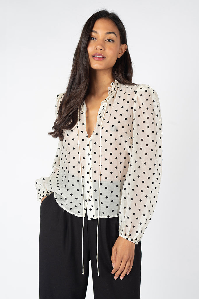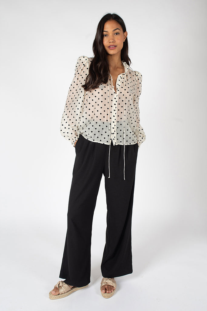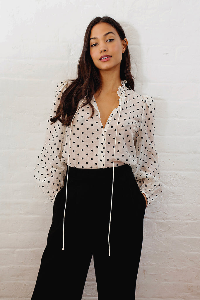 This black and white polka dot shirt is the perfect piece to add to your Spring wardrobe - wear casually or dress it up for work. Featuring long sleeves with elasticated cuffs, and a tie neck. So versatile! Also available in Red. 65% Viscose 35% Nylon.