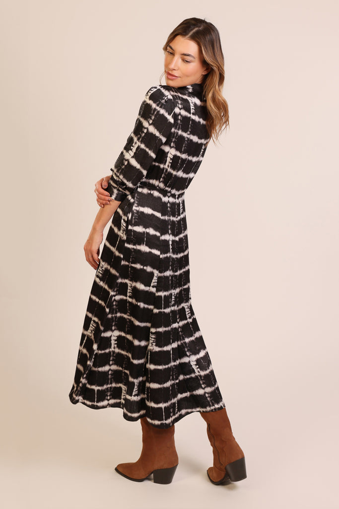 Our In the Shadows Moment Dress is a great versatile piece to add to your Autumn wardrobe. It has a button up front, with a classic V-neck shirt collar and three-quarter length sleeves. In our unique black and white brick style print.