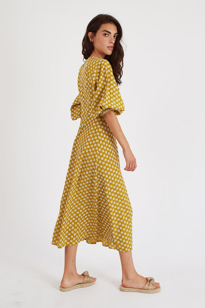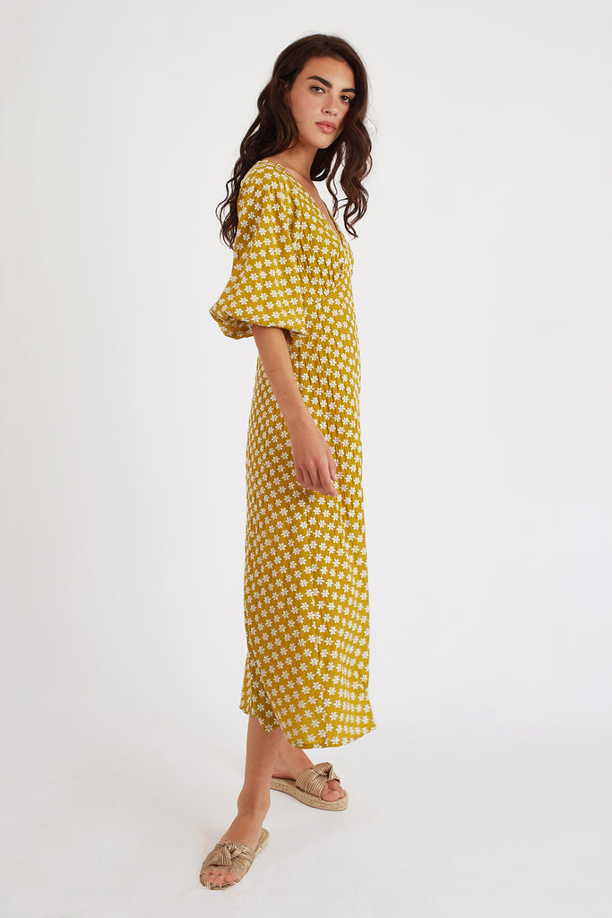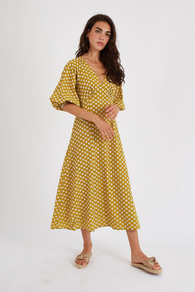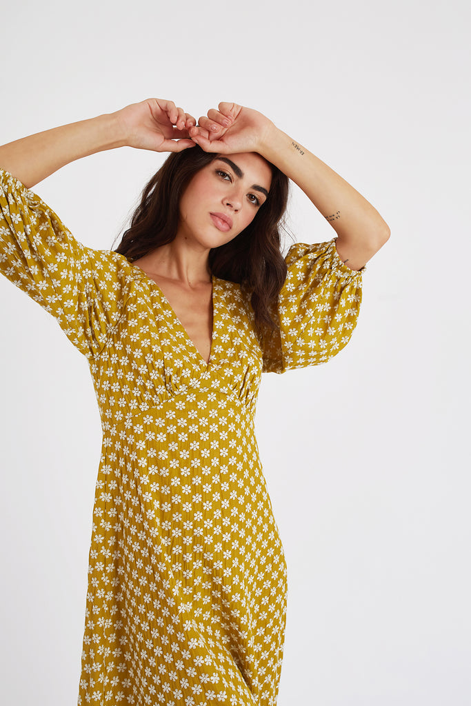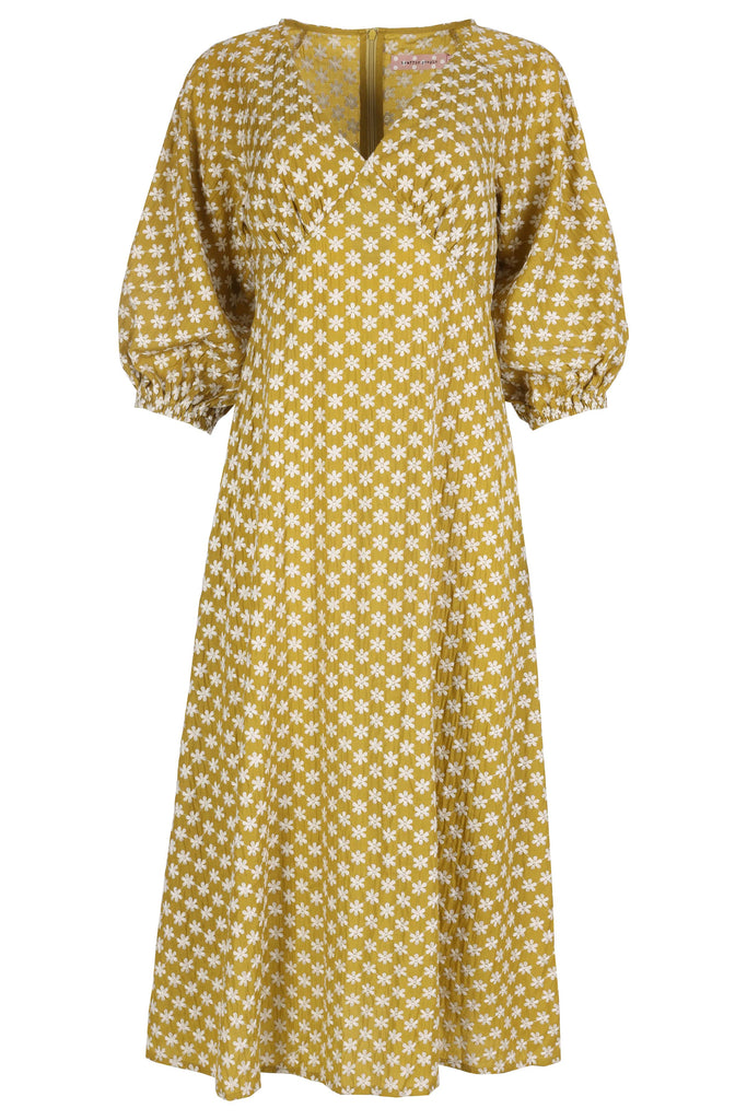 The Gloria is back and looks gorgeous in our The Chorus green and white floral. A stunning midi dress with a deep V-neck, gathering on the bust, beautiful 3/4 sleeves and elasticated cuffs. Keep it casual with some sandals and trainers, or dress it up with a pair of heels. Also available in Black. Made with sustainable materials. 100% Cotton.